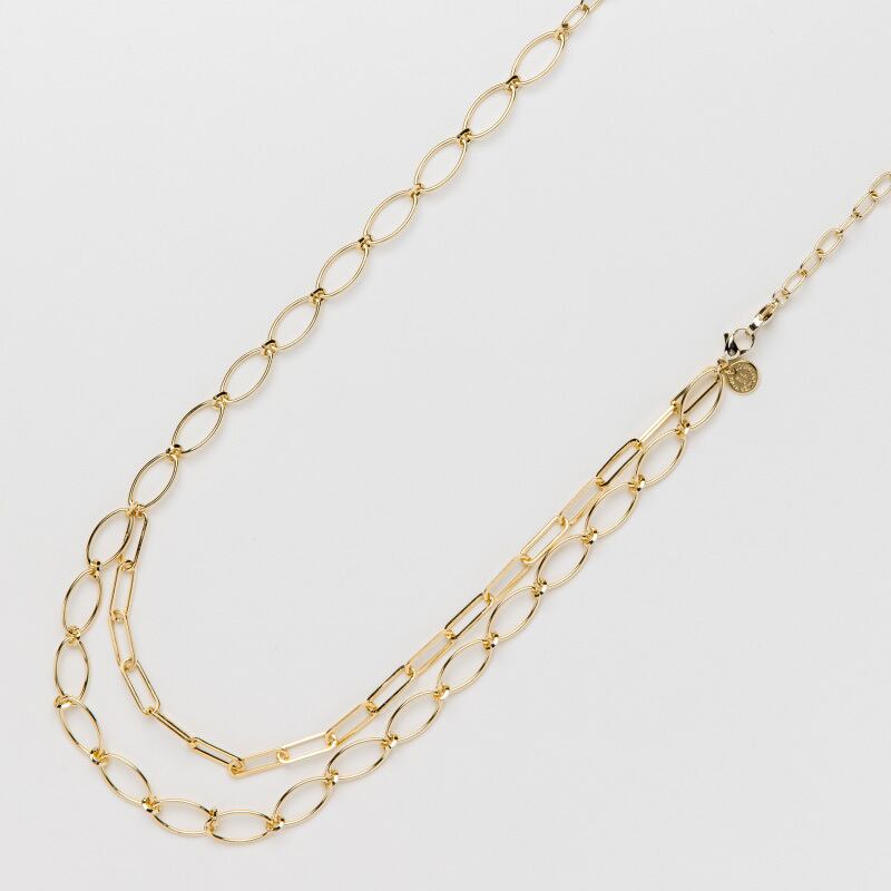 3種類のデザインチェーンを丁度良い2重の位置でレイアウトしています。お手持ちのネックレスとの重ね付けでもお洋服のコーディネートをセンスアップ、様々なシーンを魅力的に演出します。
